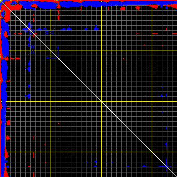 This matrix displays the maximum distance fluctuations between all pairs of CA atoms and between the two extreme conformations that were computed for this mode (DQMIN/DQMAX). Distance increases are plotted in blue and decreases in red for the strongest 10% of the residue pair distance changes. Every pixel corresponds to a single residue. Grey lines are drawn every 10 residues, yellow lines every 100 residues (counting from the upper left corner).
