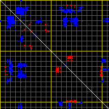 This matrix displays the maximum distance fluctuations between all pairs of CA atoms and between the two extreme conformations that were computed for this mode (DQMIN/DQMAX). Distance increases are plotted in blue and decreases in red for the strongest 10% of the residue pair distance changes. Every pixel corresponds to a single residue. Grey lines are drawn every 10 residues, yellow lines every 100 residues (counting from the upper left corner).