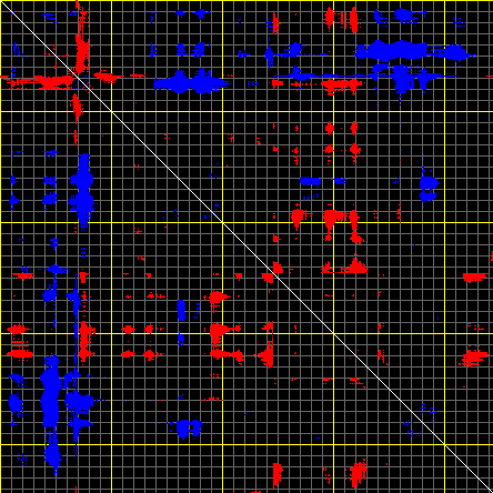 This matrix displays the maximum distance fluctuations between all pairs of CA atoms and between the two extreme conformations that were computed for this mode (DQMIN/DQMAX). Distance increases are plotted in blue and decreases in red for the strongest 10% of the residue pair distance changes. Every pixel corresponds to a single residue. Grey lines are drawn every 10 residues, yellow lines every 100 residues (counting from the upper left corner).