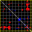This matrix displays the maximum distance fluctuations between all pairs of CA atoms and between the two extreme conformations that were computed for this mode (DQMIN/DQMAX). Distance increases are plotted in blue and decreases in red for the strongest 10% of the residue pair distance changes. Every pixel corresponds to a single residue. Grey lines are drawn every 10 residues, yellow lines every 100 residues (counting from the upper left corner).