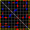 This matrix displays the maximum distance fluctuations between all pairs of CA atoms and between the two extreme conformations that were computed for this mode (DQMIN/DQMAX). Distance increases are plotted in blue and decreases in red for the strongest 10% of the residue pair distance changes. Every pixel corresponds to a single residue. Grey lines are drawn every 10 residues, yellow lines every 100 residues (counting from the upper left corner).