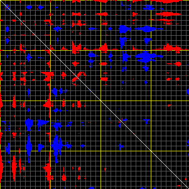 This matrix displays the maximum distance fluctuations between all pairs of CA atoms and between the two extreme conformations that were computed for this mode (DQMIN/DQMAX). Distance increases are plotted in blue and decreases in red for the strongest 10% of the residue pair distance changes. Every pixel corresponds to a single residue. Grey lines are drawn every 10 residues, yellow lines every 100 residues (counting from the upper left corner).