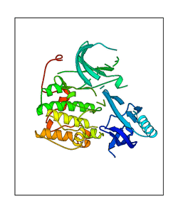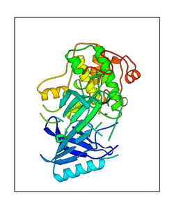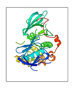 These views are prepared from three orthologuous viewpoints with MolScript. Secondary structures are determined from the C-alpha atom positions of your protein (N-terminal blue, C-terminal red).