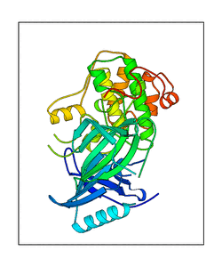 These views are prepared from three orthologuous viewpoints with MolScript. Secondary structures are determined from the C-alpha atom positions of your protein (N-terminal blue, C-terminal red).