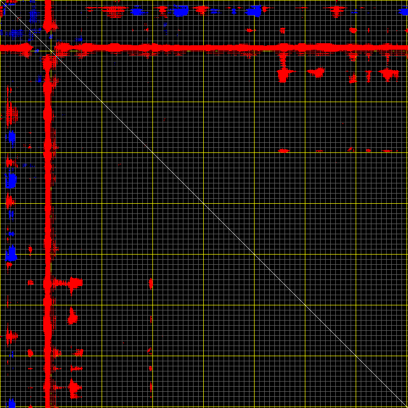 This matrix displays the maximum distance fluctuations between all pairs of CA atoms and between the two extreme conformations that were computed for this mode (DQMIN/DQMAX). Distance increases are plotted in blue and decreases in red for the strongest 10% of the residue pair distance changes. Every pixel corresponds to a single residue. Grey lines are drawn every 10 residues, yellow lines every 100 residues (counting from the upper left corner).