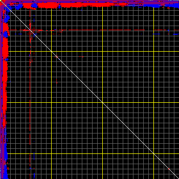 This matrix displays the maximum distance fluctuations between all pairs of CA atoms and between the two extreme conformations that were computed for this mode (DQMIN/DQMAX). Distance increases are plotted in blue and decreases in red for the strongest 10% of the residue pair distance changes. Every pixel corresponds to a single residue. Grey lines are drawn every 10 residues, yellow lines every 100 residues (counting from the upper left corner).
