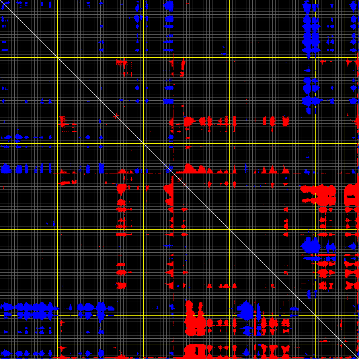 This matrix displays the maximum distance fluctuations between all pairs of CA atoms and between the two extreme conformations that were computed for this mode (DQMIN/DQMAX). Distance increases are plotted in blue and decreases in red for the strongest 10% of the residue pair distance changes. Every pixel corresponds to a single residue. Grey lines are drawn every 10 residues, yellow lines every 100 residues (counting from the upper left corner).
