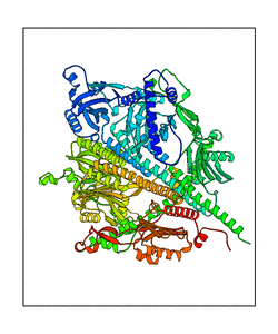 These views are prepared from three orthologuous viewpoints with MolScript. Secondary structures are determined from the C-alpha atom positions of your protein (N-terminal blue, C-terminal red).