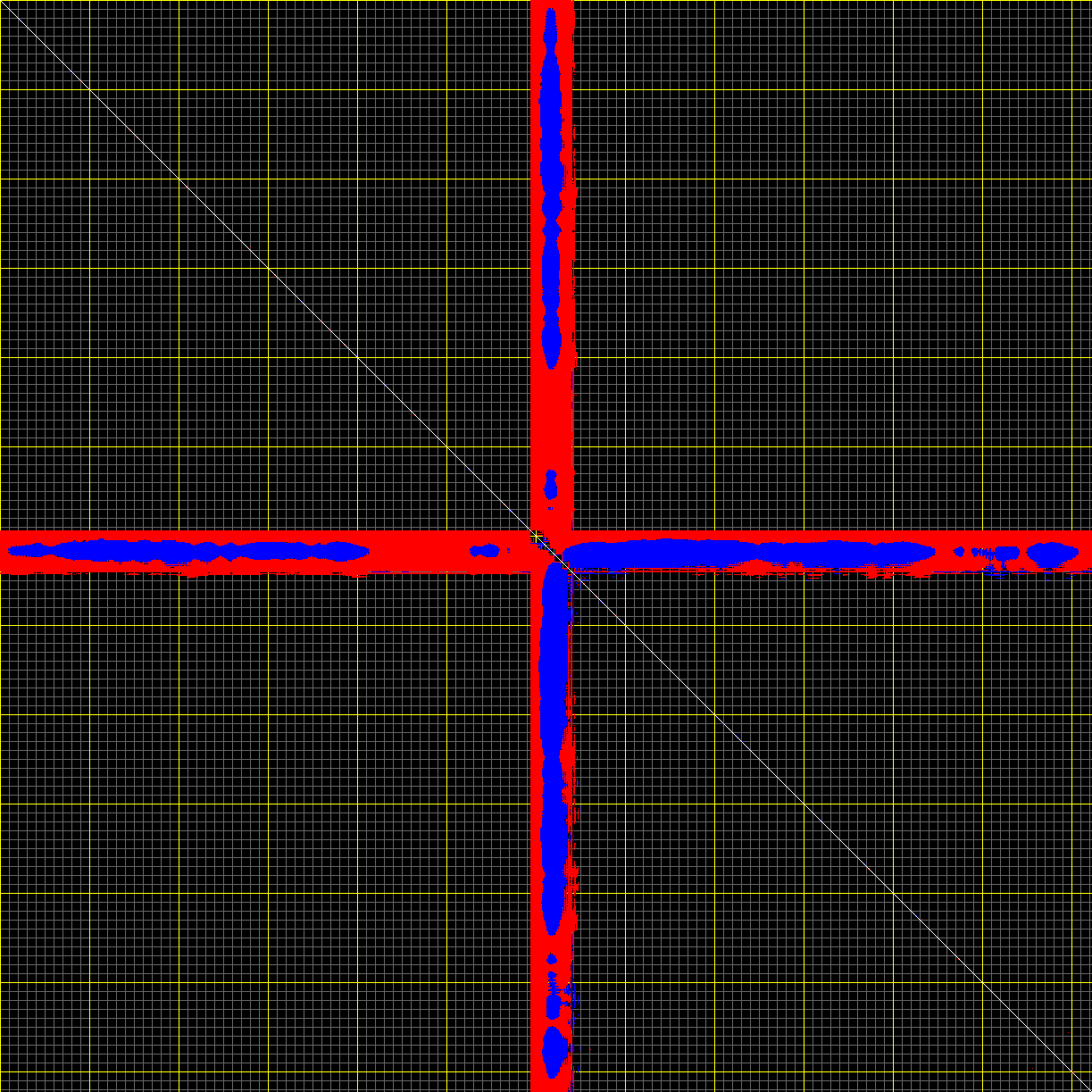 This matrix displays the maximum distance fluctuations between all pairs of CA atoms and between the two extreme conformations that were computed for this mode (DQMIN/DQMAX). Distance increases are plotted in blue and decreases in red for the strongest 10% of the residue pair distance changes. Every pixel corresponds to a single residue. Grey lines are drawn every 10 residues, yellow lines every 100 residues (counting from the upper left corner).