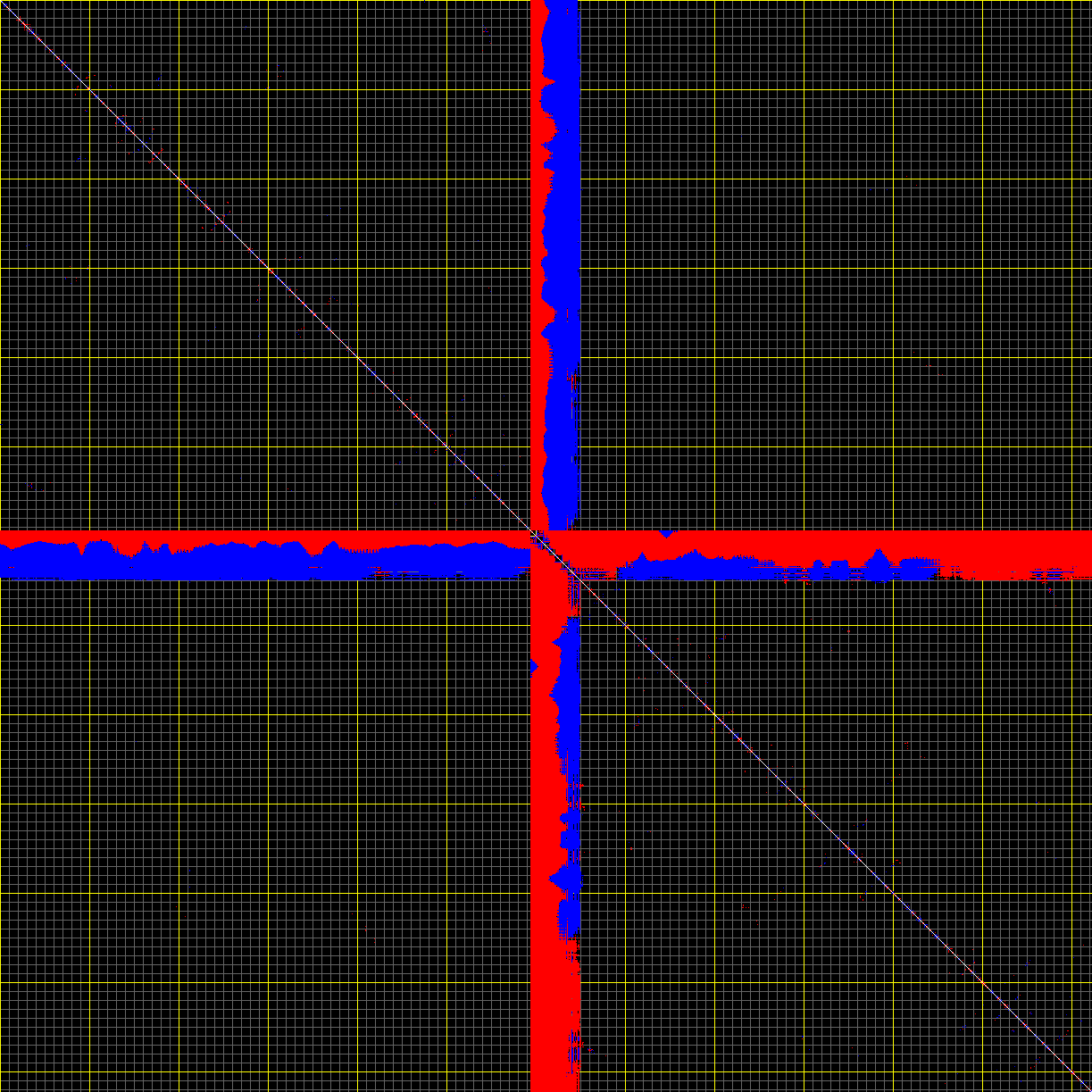 This matrix displays the maximum distance fluctuations between all pairs of CA atoms and between the two extreme conformations that were computed for this mode (DQMIN/DQMAX). Distance increases are plotted in blue and decreases in red for the strongest 10% of the residue pair distance changes. Every pixel corresponds to a single residue. Grey lines are drawn every 10 residues, yellow lines every 100 residues (counting from the upper left corner).