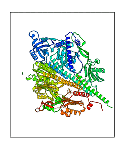These views are prepared from three orthologuous viewpoints with MolScript. Secondary structures are determined from the C-alpha atom positions of your protein (N-terminal blue, C-terminal red).