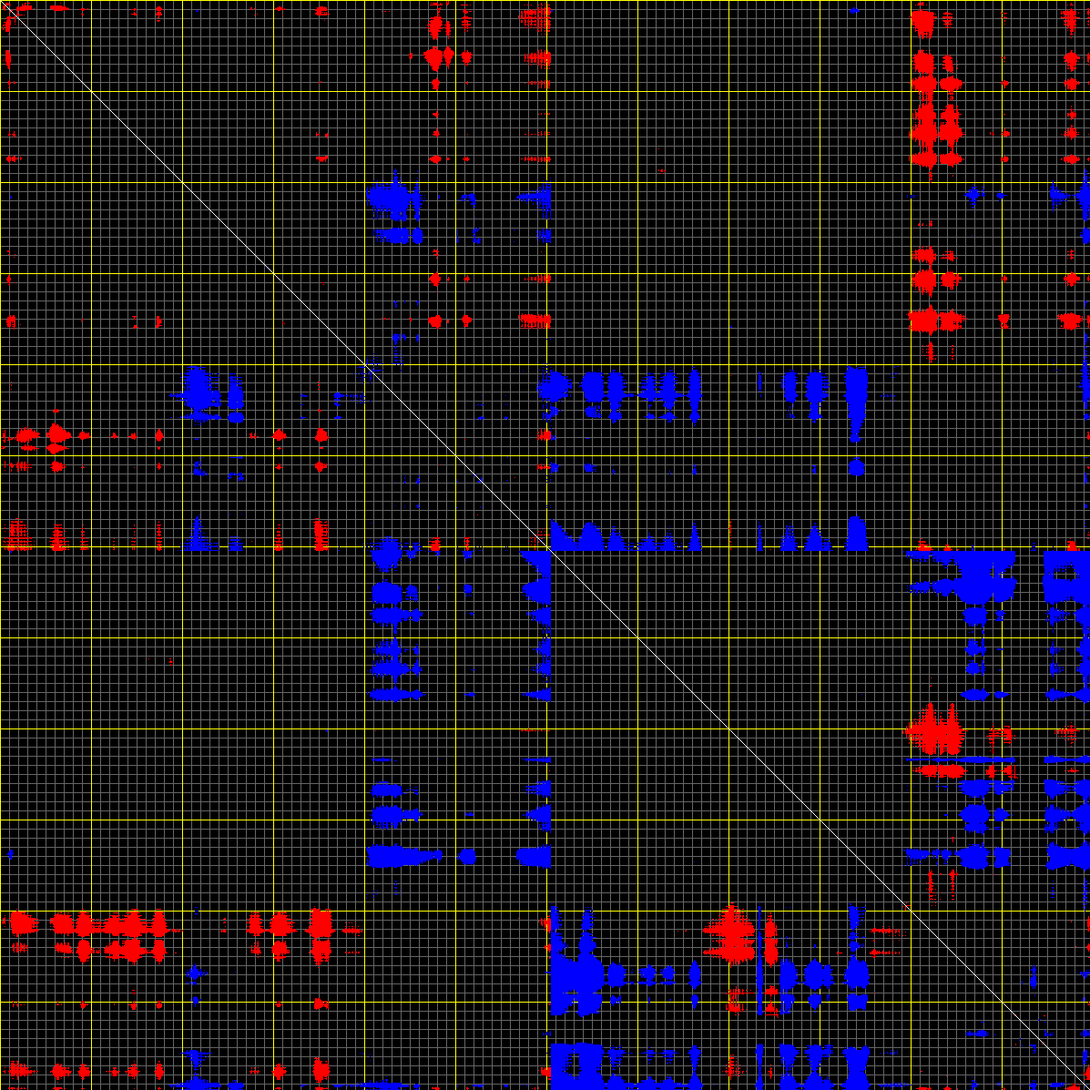 This matrix displays the maximum distance fluctuations between all pairs of CA atoms and between the two extreme conformations that were computed for this mode (DQMIN/DQMAX). Distance increases are plotted in blue and decreases in red for the strongest 10% of the residue pair distance changes. Every pixel corresponds to a single residue. Grey lines are drawn every 10 residues, yellow lines every 100 residues (counting from the upper left corner).