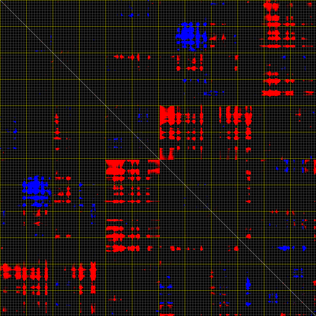 This matrix displays the maximum distance fluctuations between all pairs of CA atoms and between the two extreme conformations that were computed for this mode (DQMIN/DQMAX). Distance increases are plotted in blue and decreases in red for the strongest 10% of the residue pair distance changes. Every pixel corresponds to a single residue. Grey lines are drawn every 10 residues, yellow lines every 100 residues (counting from the upper left corner).