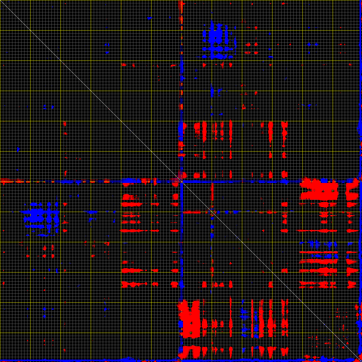 This matrix displays the maximum distance fluctuations between all pairs of CA atoms and between the two extreme conformations that were computed for this mode (DQMIN/DQMAX). Distance increases are plotted in blue and decreases in red for the strongest 10% of the residue pair distance changes. Every pixel corresponds to a single residue. Grey lines are drawn every 10 residues, yellow lines every 100 residues (counting from the upper left corner).
