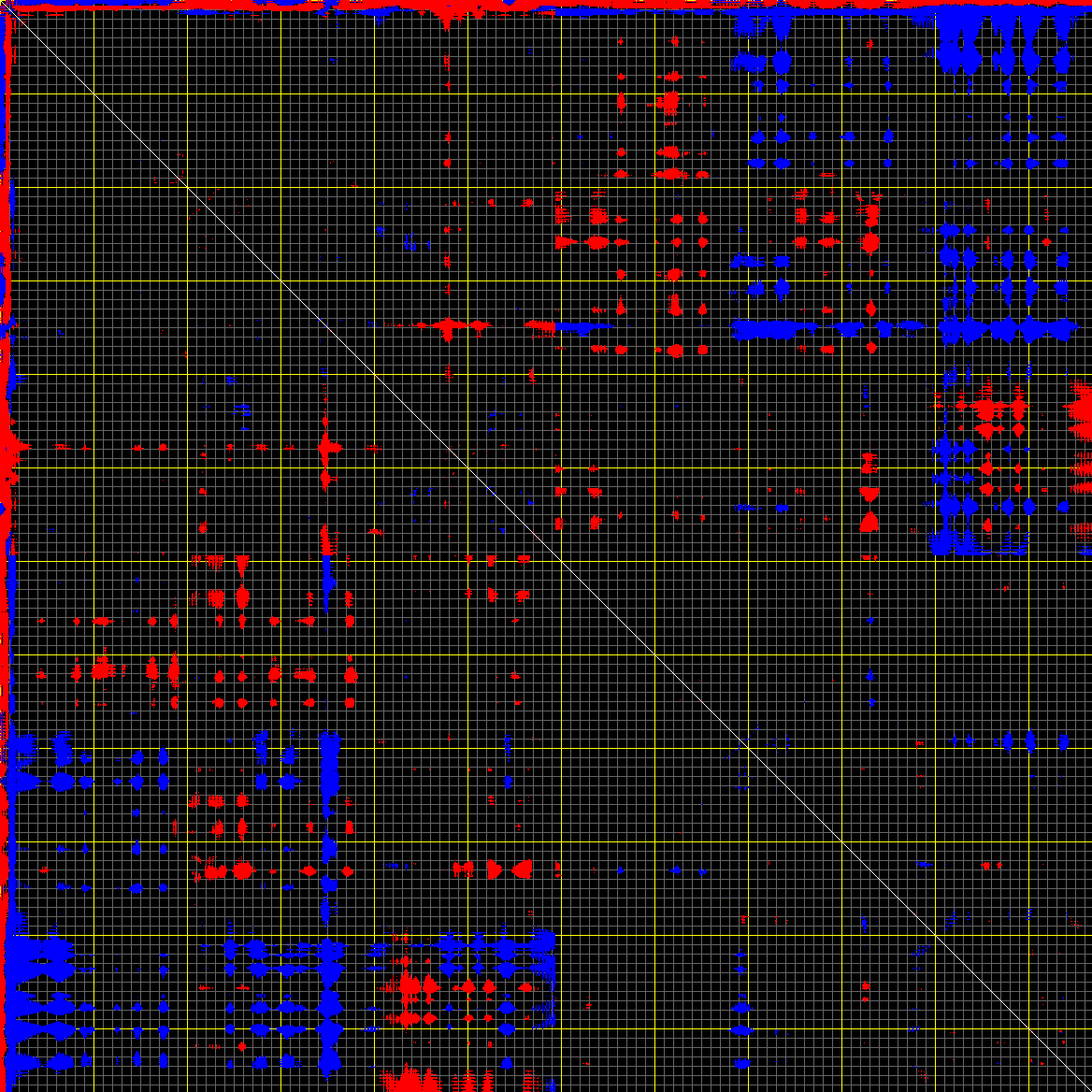 This matrix displays the maximum distance fluctuations between all pairs of CA atoms and between the two extreme conformations that were computed for this mode (DQMIN/DQMAX). Distance increases are plotted in blue and decreases in red for the strongest 10% of the residue pair distance changes. Every pixel corresponds to a single residue. Grey lines are drawn every 10 residues, yellow lines every 100 residues (counting from the upper left corner).