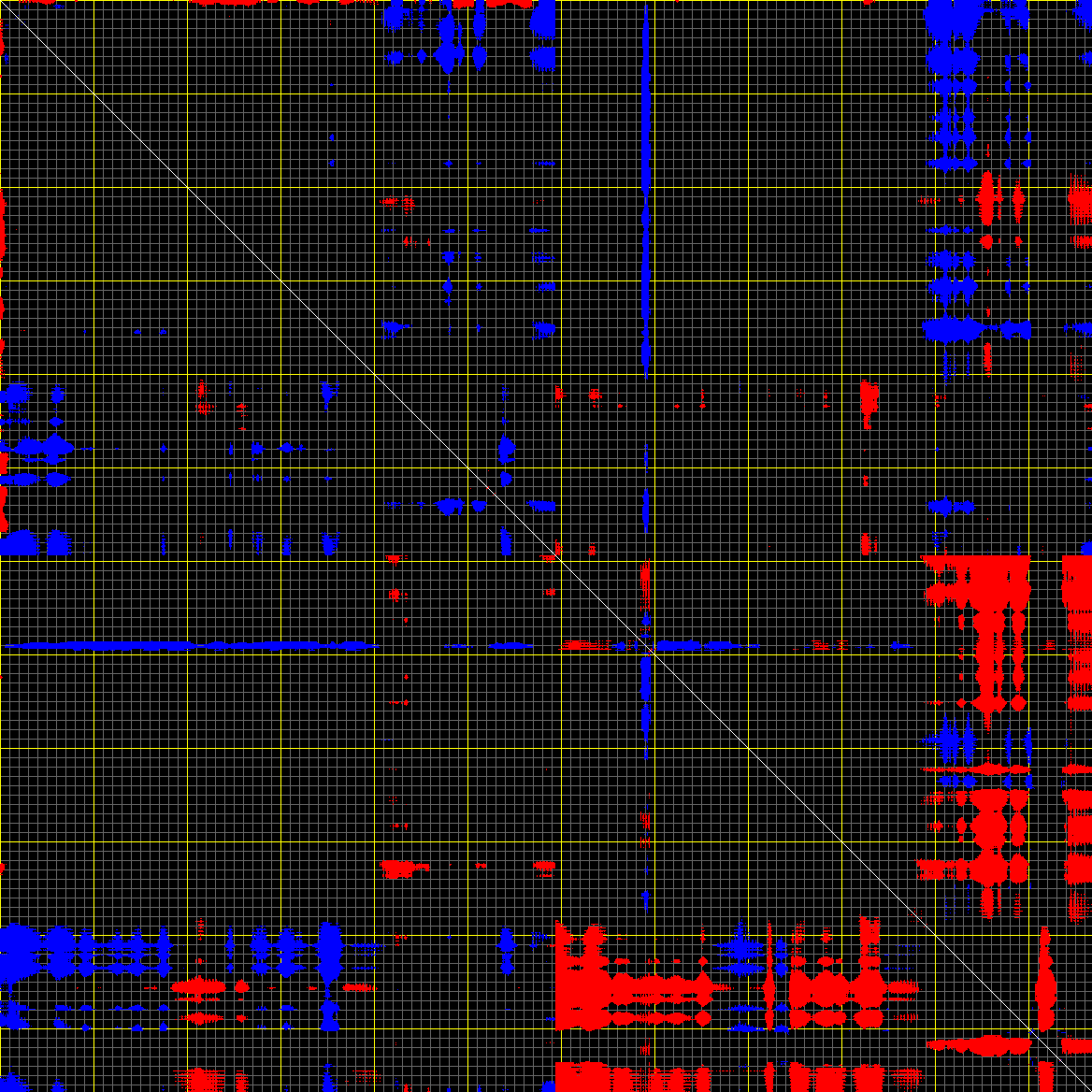 This matrix displays the maximum distance fluctuations between all pairs of CA atoms and between the two extreme conformations that were computed for this mode (DQMIN/DQMAX). Distance increases are plotted in blue and decreases in red for the strongest 10% of the residue pair distance changes. Every pixel corresponds to a single residue. Grey lines are drawn every 10 residues, yellow lines every 100 residues (counting from the upper left corner).