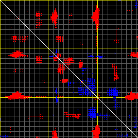 This matrix displays the maximum distance fluctuations between all pairs of CA atoms and between the two extreme conformations that were computed for this mode (DQMIN/DQMAX). Distance increases are plotted in blue and decreases in red for the strongest 10% of the residue pair distance changes. Every pixel corresponds to a single residue. Grey lines are drawn every 10 residues, yellow lines every 100 residues (counting from the upper left corner).