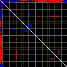 This matrix displays the maximum distance fluctuations between all pairs of CA atoms and between the two extreme conformations that were computed for this mode (DQMIN/DQMAX). Distance increases are plotted in blue and decreases in red for the strongest 10% of the residue pair distance changes. Every pixel corresponds to a single residue. Grey lines are drawn every 10 residues, yellow lines every 100 residues (counting from the upper left corner).