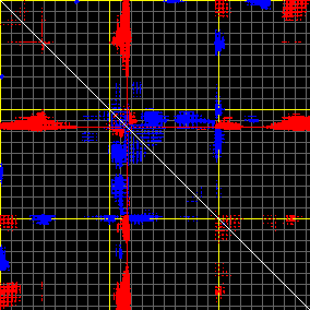 This matrix displays the maximum distance fluctuations between all pairs of CA atoms and between the two extreme conformations that were computed for this mode (DQMIN/DQMAX). Distance increases are plotted in blue and decreases in red for the strongest 10% of the residue pair distance changes. Every pixel corresponds to a single residue. Grey lines are drawn every 10 residues, yellow lines every 100 residues (counting from the upper left corner).