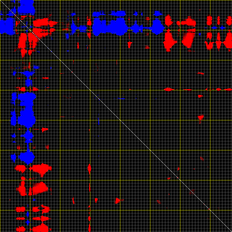 This matrix displays the maximum distance fluctuations between all pairs of CA atoms and between the two extreme conformations that were computed for this mode (DQMIN/DQMAX). Distance increases are plotted in blue and decreases in red for the strongest 10% of the residue pair distance changes. Every pixel corresponds to a single residue. Grey lines are drawn every 10 residues, yellow lines every 100 residues (counting from the upper left corner).