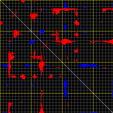 This matrix displays the maximum distance fluctuations between all pairs of CA atoms and between the two extreme conformations that were computed for this mode (DQMIN/DQMAX). Distance increases are plotted in blue and decreases in red for the strongest 10% of the residue pair distance changes. Every pixel corresponds to a single residue. Grey lines are drawn every 10 residues, yellow lines every 100 residues (counting from the upper left corner).