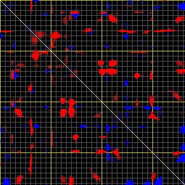 This matrix displays the maximum distance fluctuations between all pairs of CA atoms and between the two extreme conformations that were computed for this mode (DQMIN/DQMAX). Distance increases are plotted in blue and decreases in red for the strongest 10% of the residue pair distance changes. Every pixel corresponds to a single residue. Grey lines are drawn every 10 residues, yellow lines every 100 residues (counting from the upper left corner).
