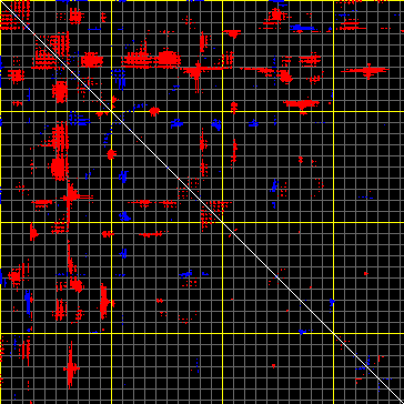 This matrix displays the maximum distance fluctuations between all pairs of CA atoms and between the two extreme conformations that were computed for this mode (DQMIN/DQMAX). Distance increases are plotted in blue and decreases in red for the strongest 10% of the residue pair distance changes. Every pixel corresponds to a single residue. Grey lines are drawn every 10 residues, yellow lines every 100 residues (counting from the upper left corner).