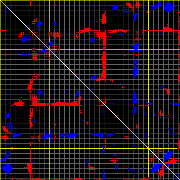 This matrix displays the maximum distance fluctuations between all pairs of CA atoms and between the two extreme conformations that were computed for this mode (DQMIN/DQMAX). Distance increases are plotted in blue and decreases in red for the strongest 10% of the residue pair distance changes. Every pixel corresponds to a single residue. Grey lines are drawn every 10 residues, yellow lines every 100 residues (counting from the upper left corner).