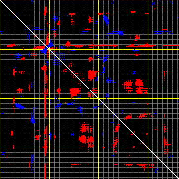 This matrix displays the maximum distance fluctuations between all pairs of CA atoms and between the two extreme conformations that were computed for this mode (DQMIN/DQMAX). Distance increases are plotted in blue and decreases in red for the strongest 10% of the residue pair distance changes. Every pixel corresponds to a single residue. Grey lines are drawn every 10 residues, yellow lines every 100 residues (counting from the upper left corner).