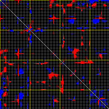 This matrix displays the maximum distance fluctuations between all pairs of CA atoms and between the two extreme conformations that were computed for this mode (DQMIN/DQMAX). Distance increases are plotted in blue and decreases in red for the strongest 10% of the residue pair distance changes. Every pixel corresponds to a single residue. Grey lines are drawn every 10 residues, yellow lines every 100 residues (counting from the upper left corner).