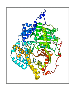 These views are prepared from three orthologuous viewpoints with MolScript. Secondary structures are determined from the C-alpha atom positions of your protein (N-terminal blue, C-terminal red).