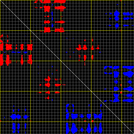 This matrix displays the maximum distance fluctuations between all pairs of CA atoms and between the two extreme conformations that were computed for this mode (DQMIN/DQMAX). Distance increases are plotted in blue and decreases in red for the strongest 10% of the residue pair distance changes. Every pixel corresponds to a single residue. Grey lines are drawn every 10 residues, yellow lines every 100 residues (counting from the upper left corner).