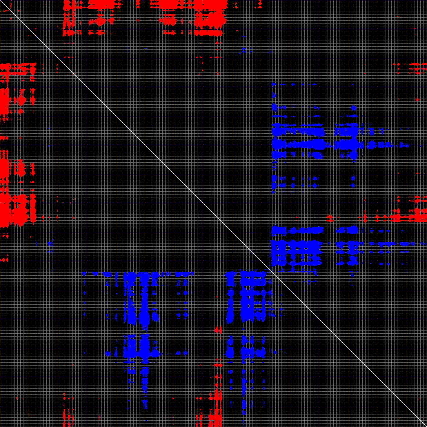This matrix displays the maximum distance fluctuations between all pairs of CA atoms and between the two extreme conformations that were computed for this mode (DQMIN/DQMAX). Distance increases are plotted in blue and decreases in red for the strongest 10% of the residue pair distance changes. Every pixel corresponds to a single residue. Grey lines are drawn every 10 residues, yellow lines every 100 residues (counting from the upper left corner).