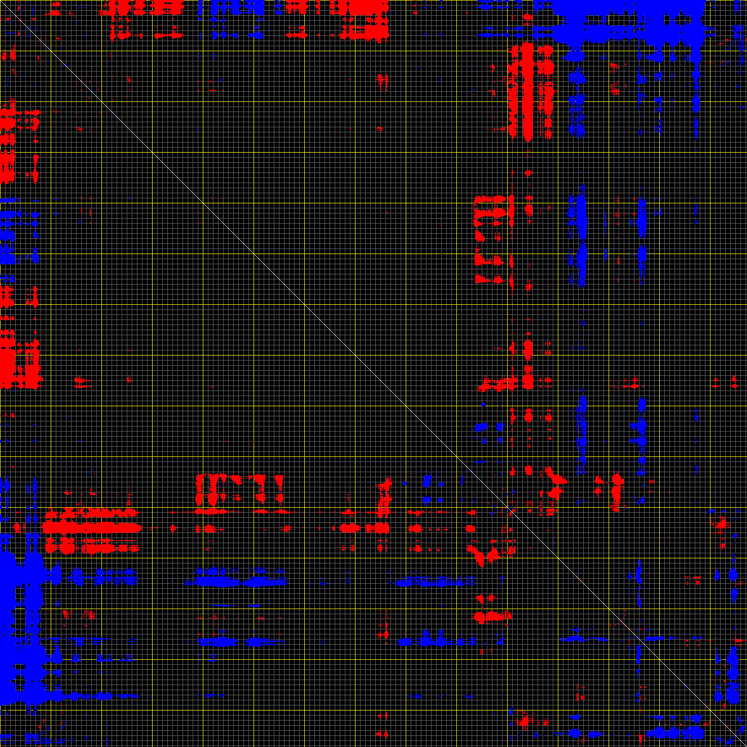 This matrix displays the maximum distance fluctuations between all pairs of CA atoms and between the two extreme conformations that were computed for this mode (DQMIN/DQMAX). Distance increases are plotted in blue and decreases in red for the strongest 10% of the residue pair distance changes. Every pixel corresponds to a single residue. Grey lines are drawn every 10 residues, yellow lines every 100 residues (counting from the upper left corner).