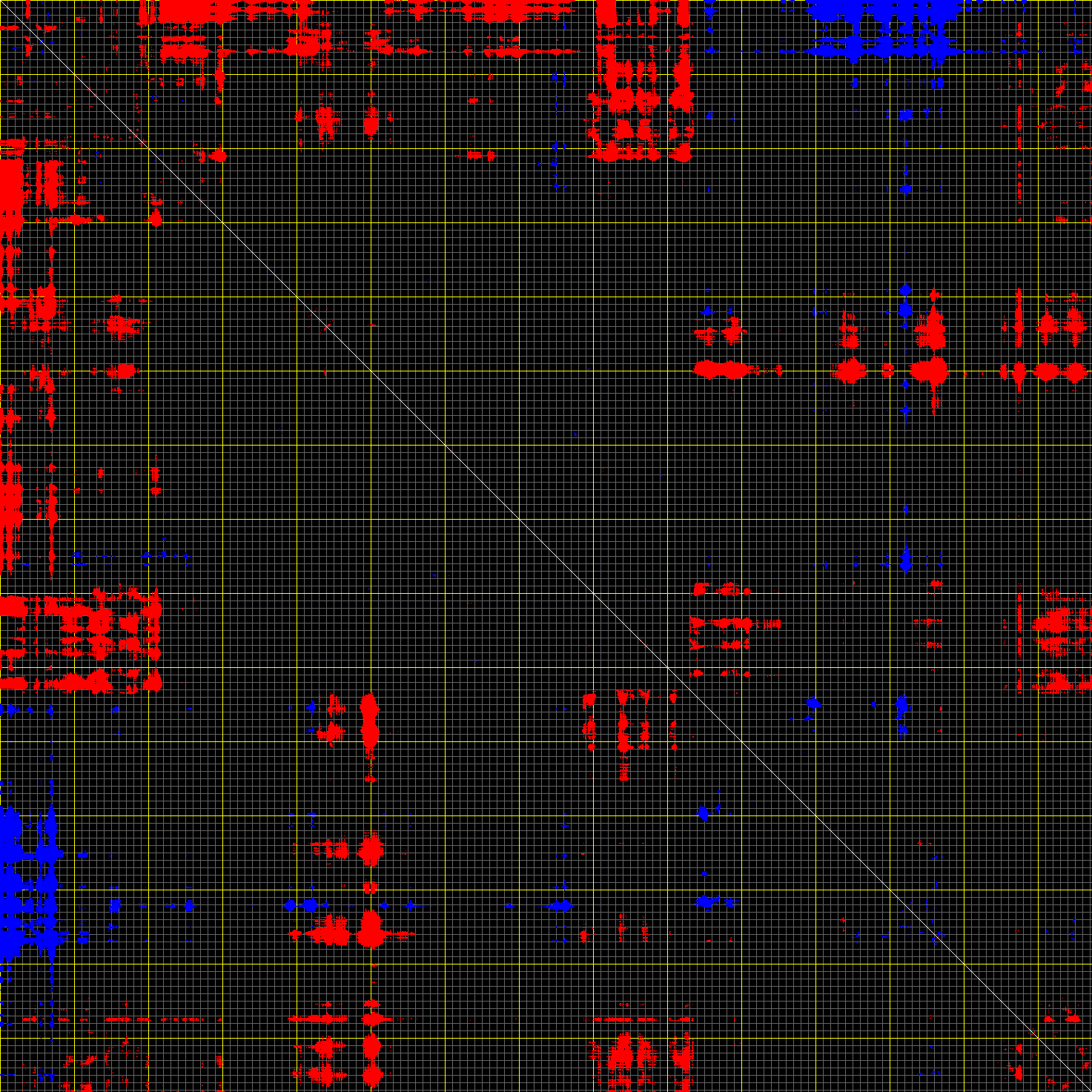 This matrix displays the maximum distance fluctuations between all pairs of CA atoms and between the two extreme conformations that were computed for this mode (DQMIN/DQMAX). Distance increases are plotted in blue and decreases in red for the strongest 10% of the residue pair distance changes. Every pixel corresponds to a single residue. Grey lines are drawn every 10 residues, yellow lines every 100 residues (counting from the upper left corner).