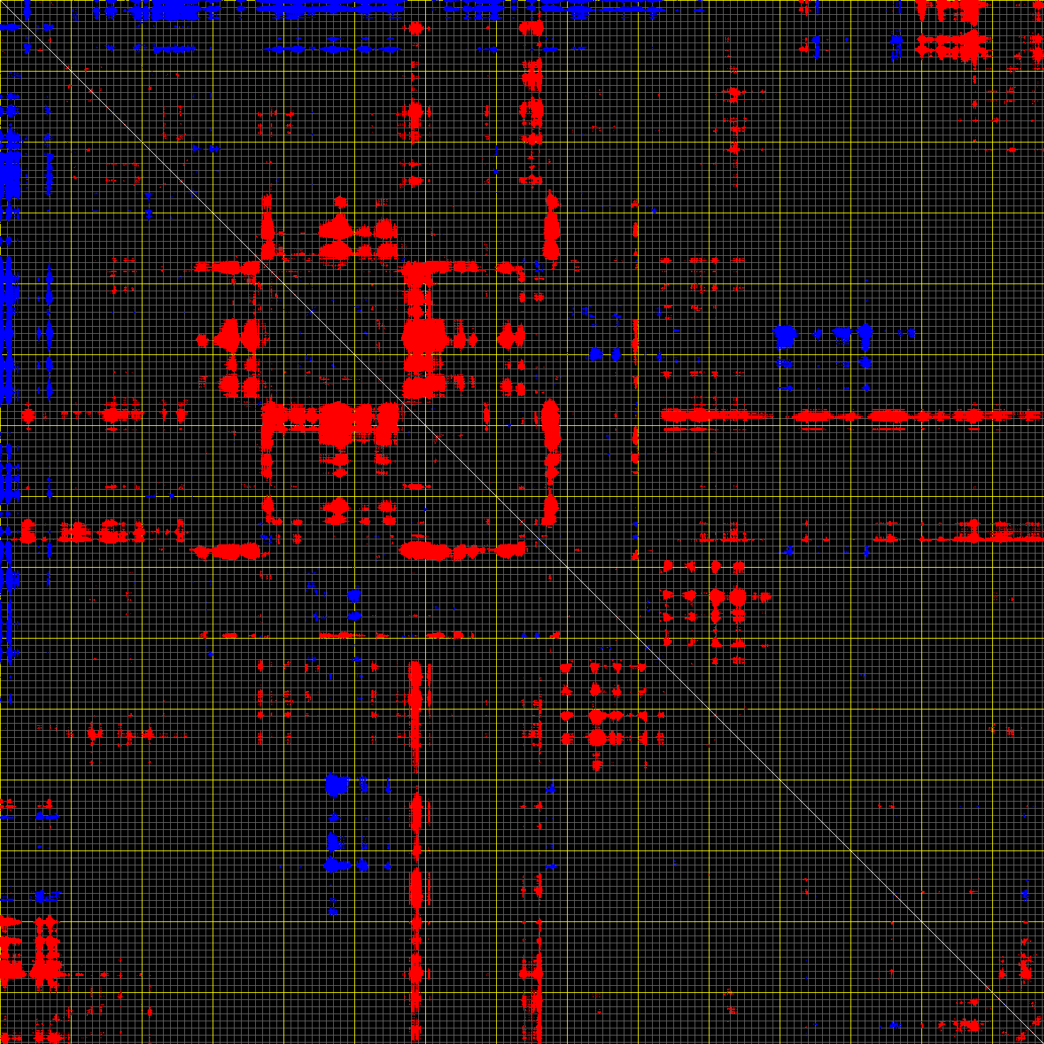 This matrix displays the maximum distance fluctuations between all pairs of CA atoms and between the two extreme conformations that were computed for this mode (DQMIN/DQMAX). Distance increases are plotted in blue and decreases in red for the strongest 10% of the residue pair distance changes. Every pixel corresponds to a single residue. Grey lines are drawn every 10 residues, yellow lines every 100 residues (counting from the upper left corner).