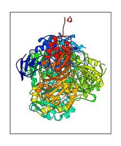 These views are prepared from three orthologuous viewpoints with MolScript. Secondary structures are determined from the C-alpha atom positions of your protein (N-terminal blue, C-terminal red).