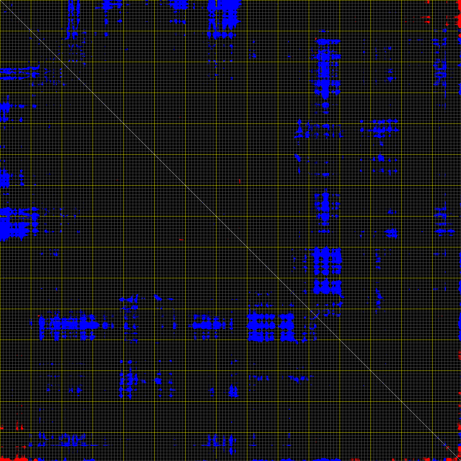 This matrix displays the maximum distance fluctuations between all pairs of CA atoms and between the two extreme conformations that were computed for this mode (DQMIN/DQMAX). Distance increases are plotted in blue and decreases in red for the strongest 10% of the residue pair distance changes. Every pixel corresponds to a single residue. Grey lines are drawn every 10 residues, yellow lines every 100 residues (counting from the upper left corner).