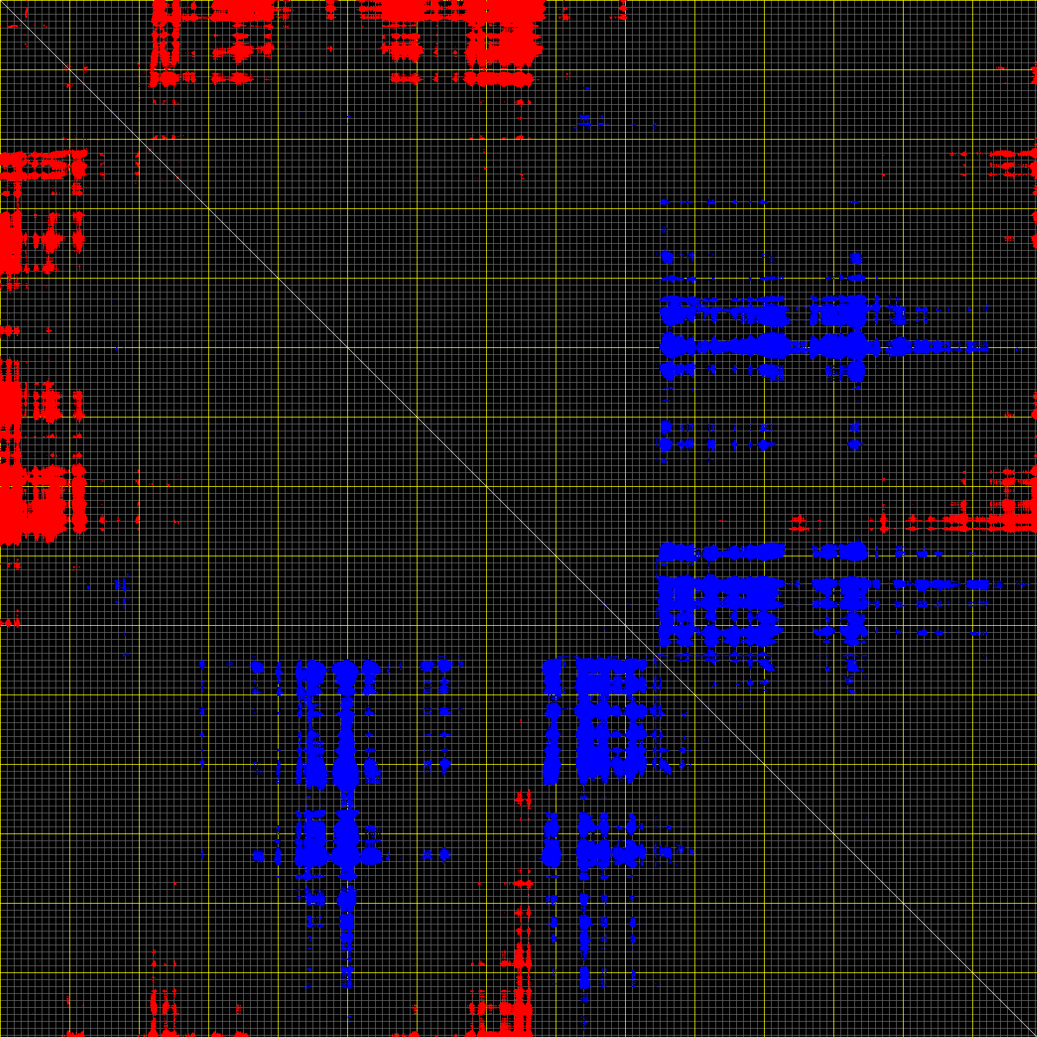 This matrix displays the maximum distance fluctuations between all pairs of CA atoms and between the two extreme conformations that were computed for this mode (DQMIN/DQMAX). Distance increases are plotted in blue and decreases in red for the strongest 10% of the residue pair distance changes. Every pixel corresponds to a single residue. Grey lines are drawn every 10 residues, yellow lines every 100 residues (counting from the upper left corner).