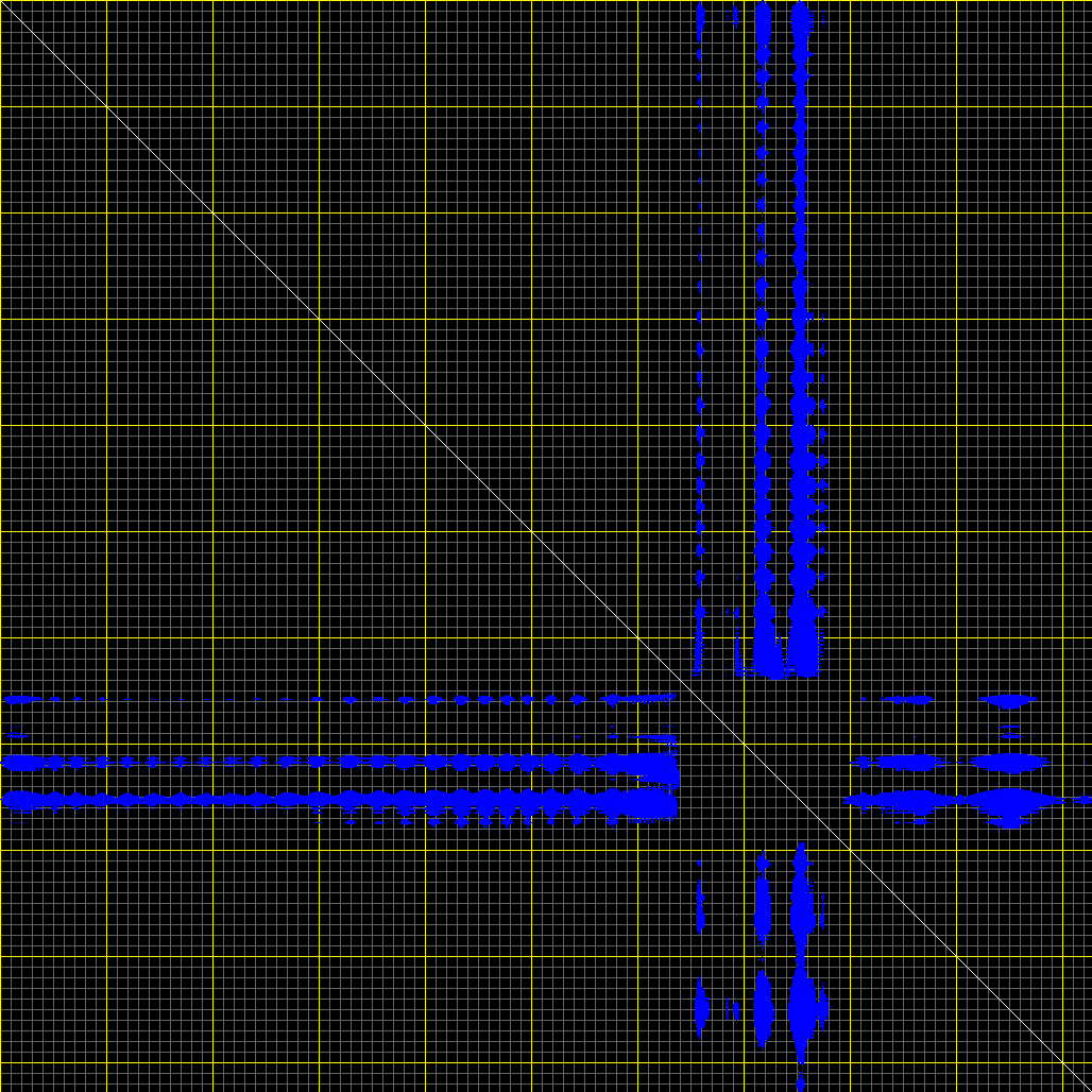 This matrix displays the maximum distance fluctuations between all pairs of CA atoms and between the two extreme conformations that were computed for this mode (DQMIN/DQMAX). Distance increases are plotted in blue and decreases in red for the strongest 10% of the residue pair distance changes. Every pixel corresponds to a single residue. Grey lines are drawn every 10 residues, yellow lines every 100 residues (counting from the upper left corner).