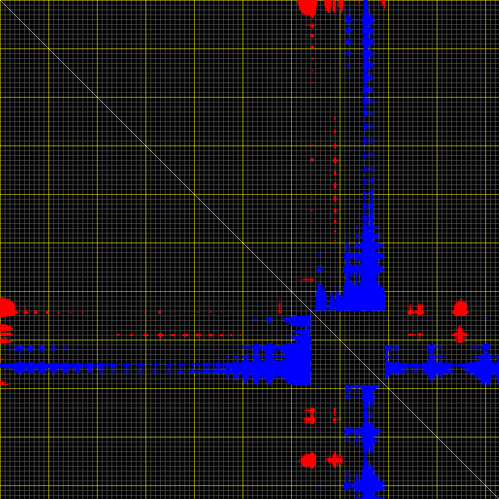 This matrix displays the maximum distance fluctuations between all pairs of CA atoms and between the two extreme conformations that were computed for this mode (DQMIN/DQMAX). Distance increases are plotted in blue and decreases in red for the strongest 10% of the residue pair distance changes. Every pixel corresponds to a single residue. Grey lines are drawn every 10 residues, yellow lines every 100 residues (counting from the upper left corner).