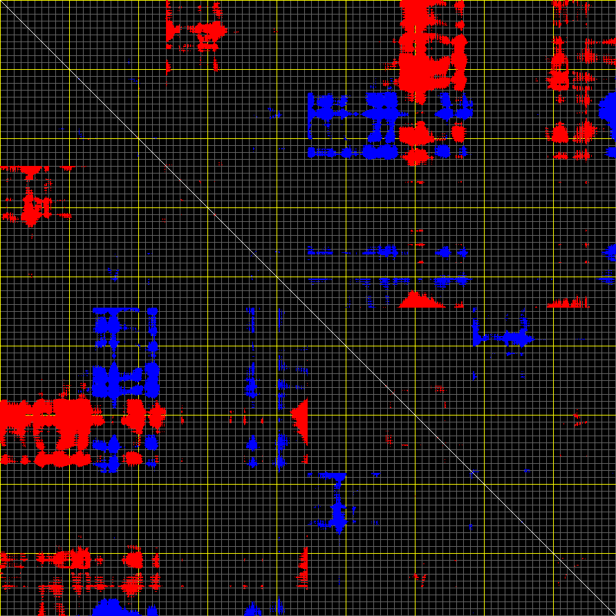 This matrix displays the maximum distance fluctuations between all pairs of CA atoms and between the two extreme conformations that were computed for this mode (DQMIN/DQMAX). Distance increases are plotted in blue and decreases in red for the strongest 10% of the residue pair distance changes. Every pixel corresponds to a single residue. Grey lines are drawn every 10 residues, yellow lines every 100 residues (counting from the upper left corner).