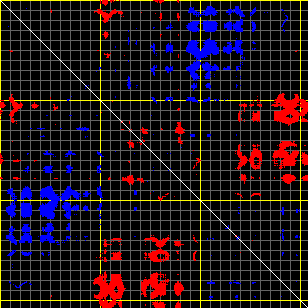 This matrix displays the maximum distance fluctuations between all pairs of CA atoms and between the two extreme conformations that were computed for this mode (DQMIN/DQMAX). Distance increases are plotted in blue and decreases in red for the strongest 10% of the residue pair distance changes. Every pixel corresponds to a single residue. Grey lines are drawn every 10 residues, yellow lines every 100 residues (counting from the upper left corner).