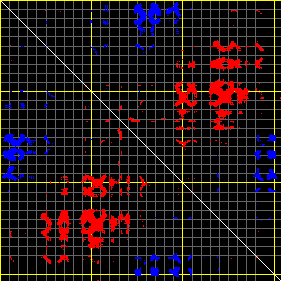This matrix displays the maximum distance fluctuations between all pairs of CA atoms and between the two extreme conformations that were computed for this mode (DQMIN/DQMAX). Distance increases are plotted in blue and decreases in red for the strongest 10% of the residue pair distance changes. Every pixel corresponds to a single residue. Grey lines are drawn every 10 residues, yellow lines every 100 residues (counting from the upper left corner).