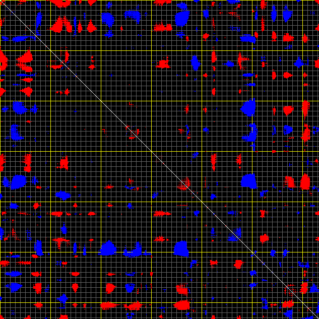 This matrix displays the maximum distance fluctuations between all pairs of CA atoms and between the two extreme conformations that were computed for this mode (DQMIN/DQMAX). Distance increases are plotted in blue and decreases in red for the strongest 10% of the residue pair distance changes. Every pixel corresponds to a single residue. Grey lines are drawn every 10 residues, yellow lines every 100 residues (counting from the upper left corner).