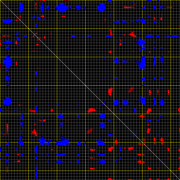 This matrix displays the maximum distance fluctuations between all pairs of CA atoms and between the two extreme conformations that were computed for this mode (DQMIN/DQMAX). Distance increases are plotted in blue and decreases in red for the strongest 10% of the residue pair distance changes. Every pixel corresponds to a single residue. Grey lines are drawn every 10 residues, yellow lines every 100 residues (counting from the upper left corner).
