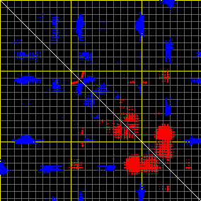 This matrix displays the maximum distance fluctuations between all pairs of CA atoms and between the two extreme conformations that were computed for this mode (DQMIN/DQMAX). Distance increases are plotted in blue and decreases in red for the strongest 10% of the residue pair distance changes. Every pixel corresponds to a single residue. Grey lines are drawn every 10 residues, yellow lines every 100 residues (counting from the upper left corner).