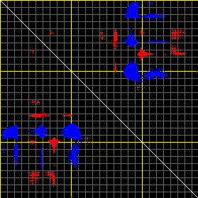 This matrix displays the maximum distance fluctuations between all pairs of CA atoms and between the two extreme conformations that were computed for this mode (DQMIN/DQMAX). Distance increases are plotted in blue and decreases in red for the strongest 10% of the residue pair distance changes. Every pixel corresponds to a single residue. Grey lines are drawn every 10 residues, yellow lines every 100 residues (counting from the upper left corner).