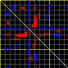 This matrix displays the maximum distance fluctuations between all pairs of CA atoms and between the two extreme conformations that were computed for this mode (DQMIN/DQMAX). Distance increases are plotted in blue and decreases in red for the strongest 10% of the residue pair distance changes. Every pixel corresponds to a single residue. Grey lines are drawn every 10 residues, yellow lines every 100 residues (counting from the upper left corner).
