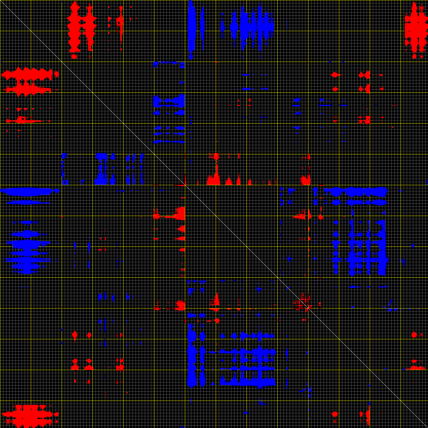 This matrix displays the maximum distance fluctuations between all pairs of CA atoms and between the two extreme conformations that were computed for this mode (DQMIN/DQMAX). Distance increases are plotted in blue and decreases in red for the strongest 10% of the residue pair distance changes. Every pixel corresponds to a single residue. Grey lines are drawn every 10 residues, yellow lines every 100 residues (counting from the upper left corner).